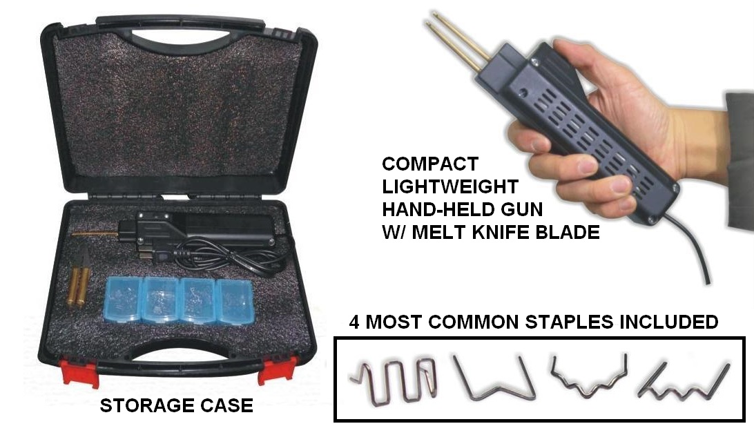 This compact system includes melt-gun with 115-volt power cord, four types of the most popular stainless steel scored-leg staples in 25-packs, straight & curved melt-knife blades to reflow “set” staple & operator manual all in a heavy-duty clam shell storage case.